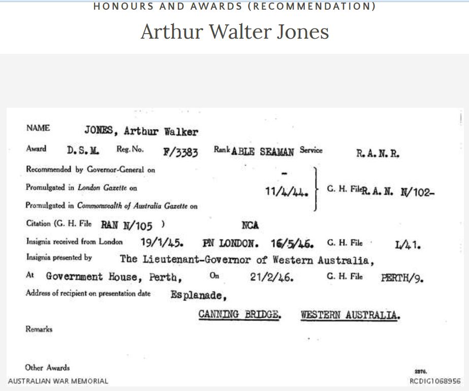 | Milit-Beg* | Arthur Walter Jones DSM began military service on 17 February 1941 at Perth, Western AustraliaG, F3383, Able Seaman, HMAS Leeuwin, RAN.2 |