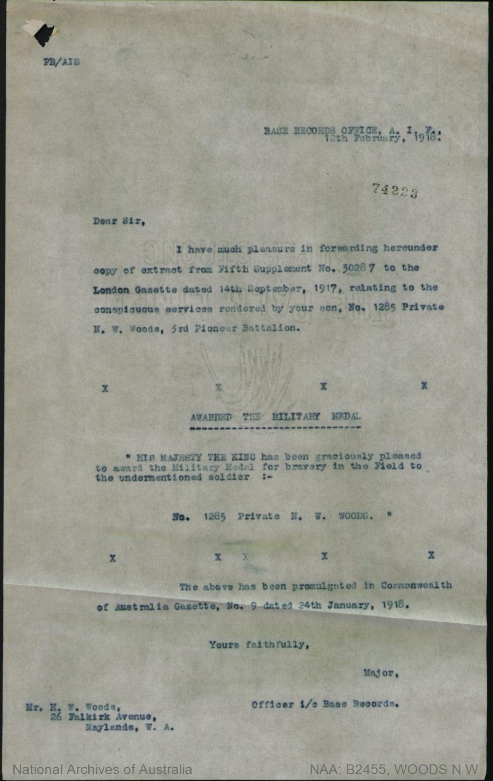 | Honours* | He was awarded the Military Medal on 14 July 1917 at Gapaard, Messines Ridge, France, 'On the night of the 14th/15th July, 1917, near GAPAARD, MESSINES RIDGE, Private WOODS was a member of a working party engaged just behind the front line, when one of our infantry patrols (34th Infantry Battalion) was attacked, one member of that patrol was wounded and left in No Man's Land, about 300 yards from our front line, and as no stretcher bearers were available, volunteers were called for, and Private WOODS and an infantry man went out and brought the wounded man in to a place of safety behind our line. This action was carried out under heavy shell fire. Private WOODS showed great courage and determination in carrying out the act he had volunteered for, and was a fine example to those who witnessed the action.' Source: 'Commonwealth Gazette' No. 9, Date: 24 January 1918.2 |